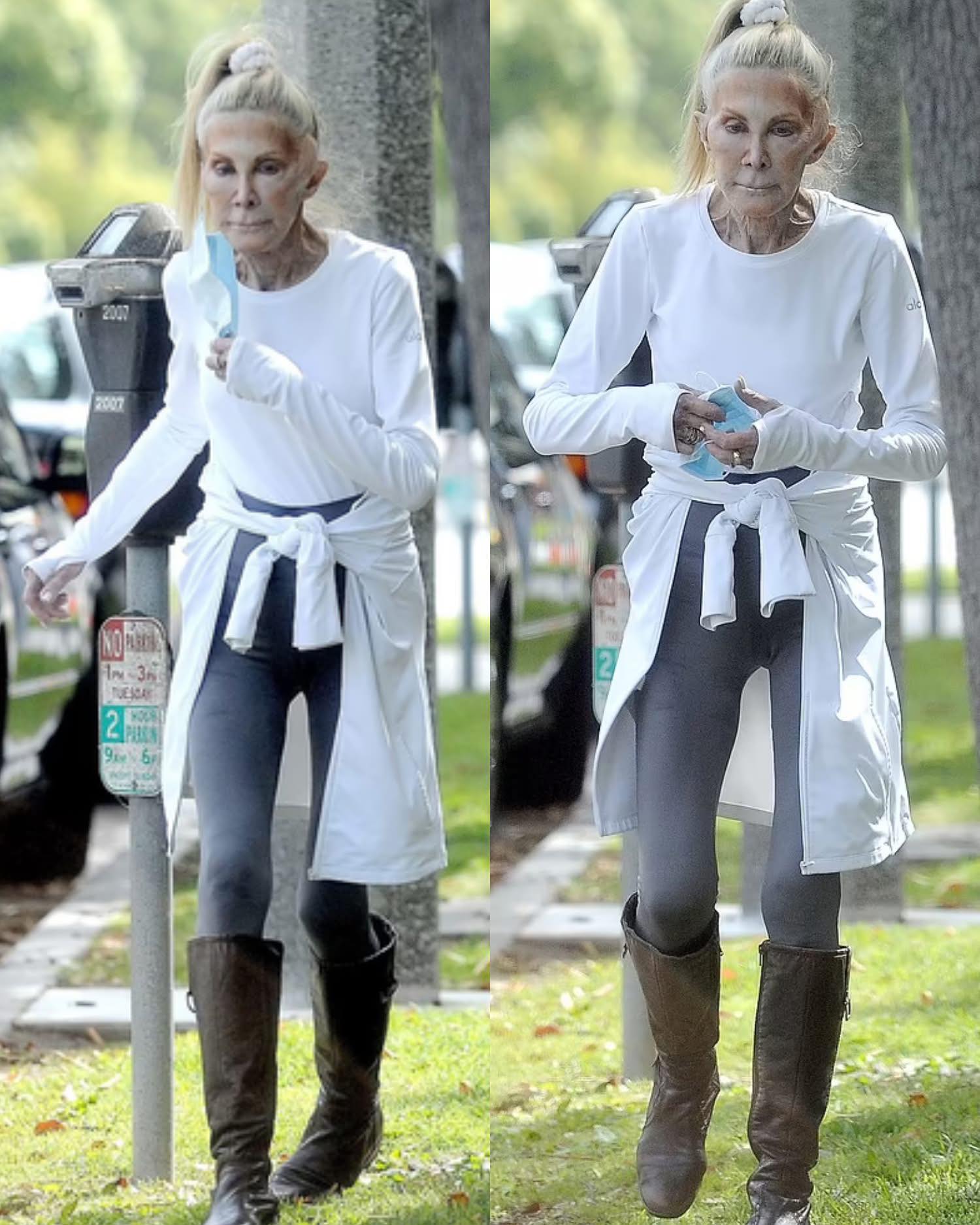 At 78 years old, Joan displayed a vitality that transcended her Hollywood fame. Watching her handle a parking meter with focused energy, dressed in casual athleticwear and tall brown boots, was a lesson in modern poise.