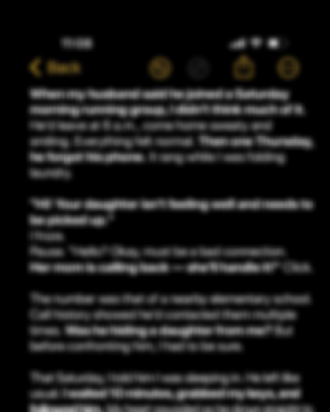 That Saturday I pretended to sleep as he left, then followed him in my car. He drove to the park, stretched, and fell into stride with two other men. They ran loops, checked watches, laughed just as he’d described. Relief flickered, but I remembered the calls—and I waited. After forty minutes, a little girl in pigtails bounded down the path toward one of the men—Jake—who swept her into his arms. Nick never glanced back. I watched until their run ended, then drove home, a swirl of relief and embarrassment churning inside me.