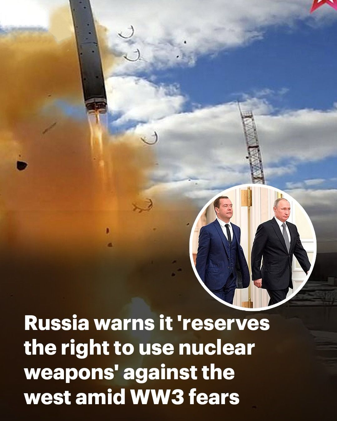It comes as Moscow also stressed it reserves the right to use nuclear weapons against the west. Pictured: Putin’s ex-premier Dmitry Medvedev