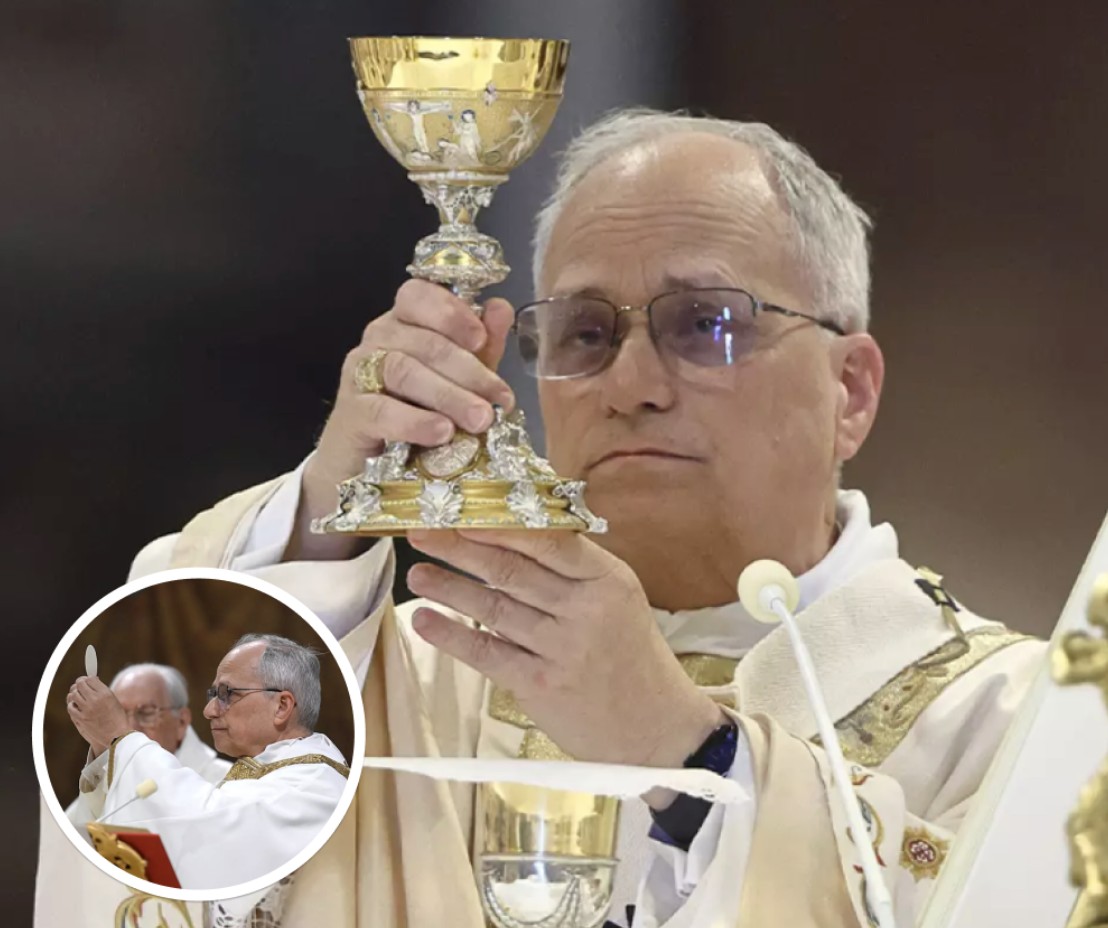 Pope Leo XIV elevating the Body of Christ in a mass wearing a fitness watch, Photo Credit: cassie/X