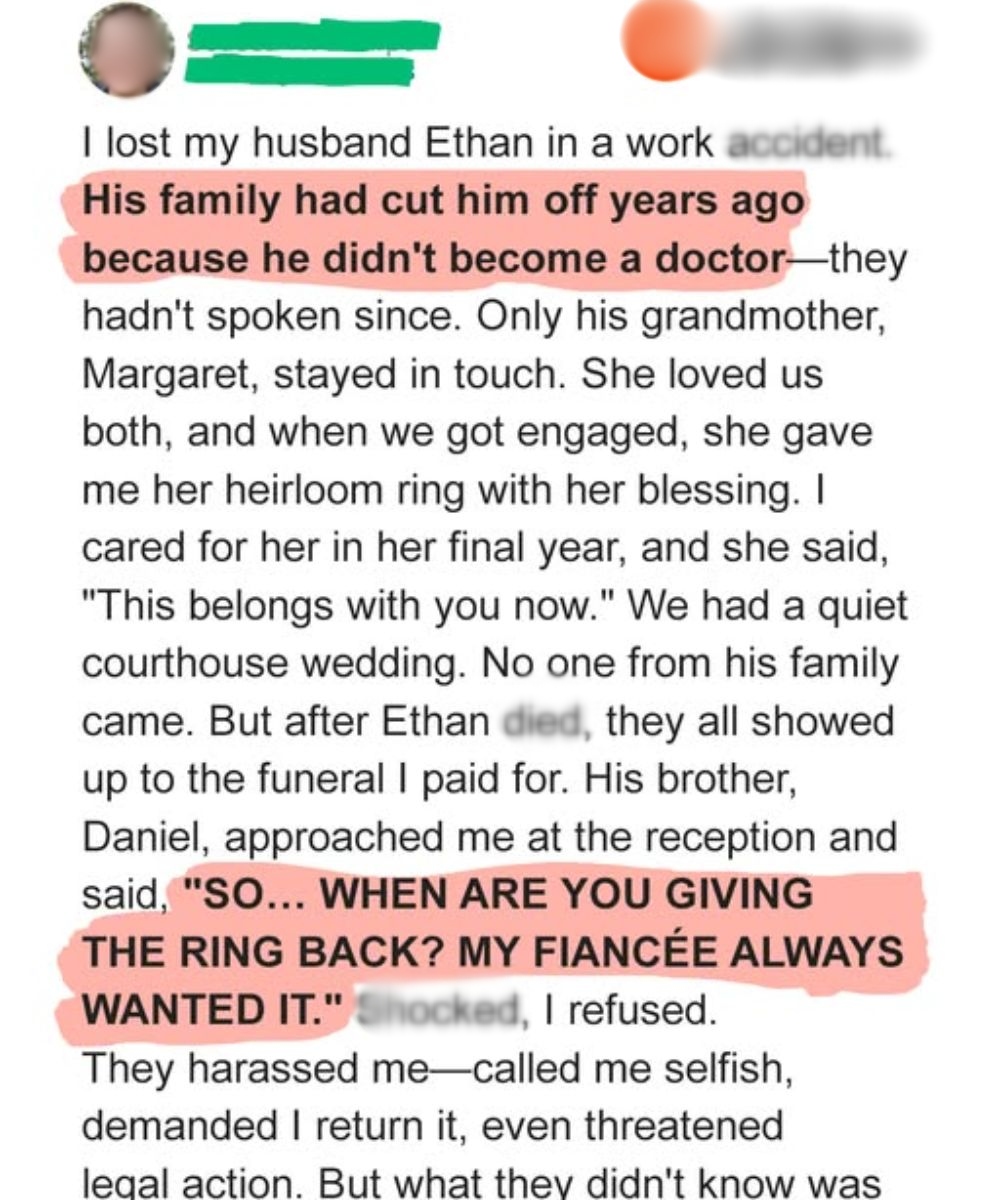 “Grief doesn’t give you the right to rewrite history. That ring belongs to family.”