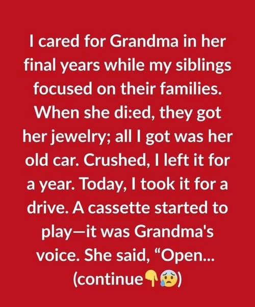 Suddenly, Grandma’s voice filled the car, clear and strong as I remembered it from her healthier days. “Hello, my dear Sara,” she said, and I nearly had to pull over from the shock of hearing her again. “If you’re listening to this, then I’m gone, and you’re probably feeling confused about why I left you that old car.”