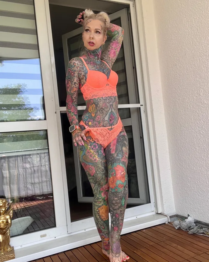 Despite the unconventional nature of her body art, Kerstin’s unique look has garnered significant attention and a dedicated fan base. She boasts more than 195,000 followers on Instagram, where she proudly showcases her colorful tattoos. Her followers shower her with admiration and compliments, describing her inked body as “a beautiful work of art” and expressing awe with comments like “Wow, stunning photo.”