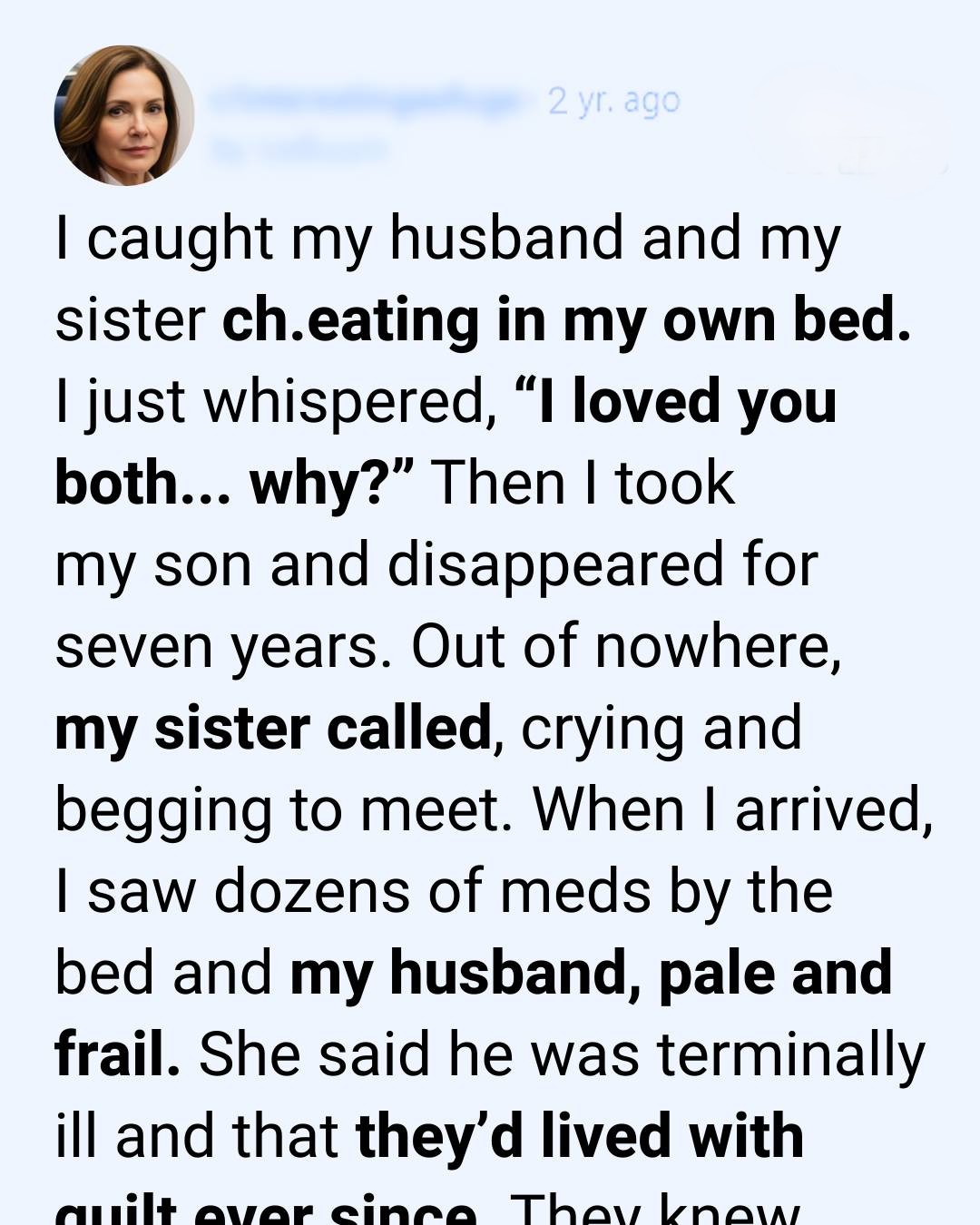 My husband’s body looked like it had already begun saying goodbye. Illness had hollowed him out, leaving behind someone fragile and unfamiliar. My sister sat nearby, her eyes rimmed with sleeplessness and shame, her posture bent inward as if trying to disappear. The room carried the heavy stillness of regret. No one asked me to forgive them. No one tried to justify what they had done. There were no speeches, no pleas, only the quiet acknowledgment that this was the consequence of their choices.