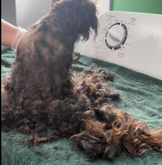 They worked patiently, gently, speaking softly as they began to free her from the heavy layers that had hidden her for so long. The sound of clippers filled the room, steady and calm. As each section was carefully removed, more of Pear emerged—her face, her neck, her thin legs.