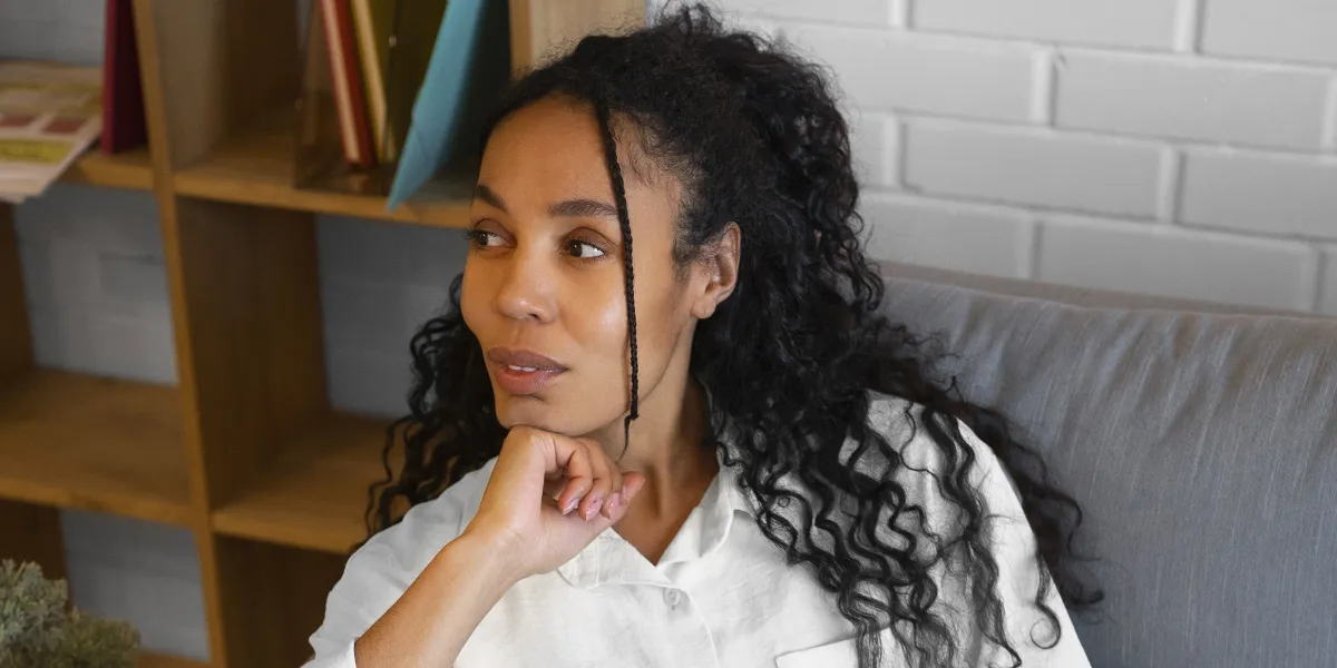 A woman sitting on a couch, looking to the side | Source: Midjourney